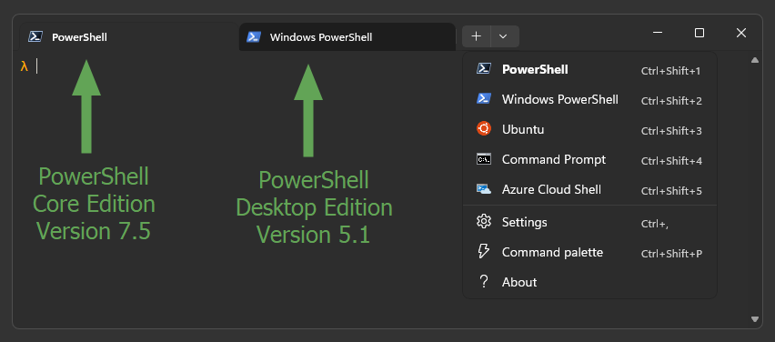 Read more about the differences between these versions at Differences between Windows PowerShell 5.1 and PowerShell 7.x and Migrating from Windows PowerShell 5.1 to PowerShell 7.